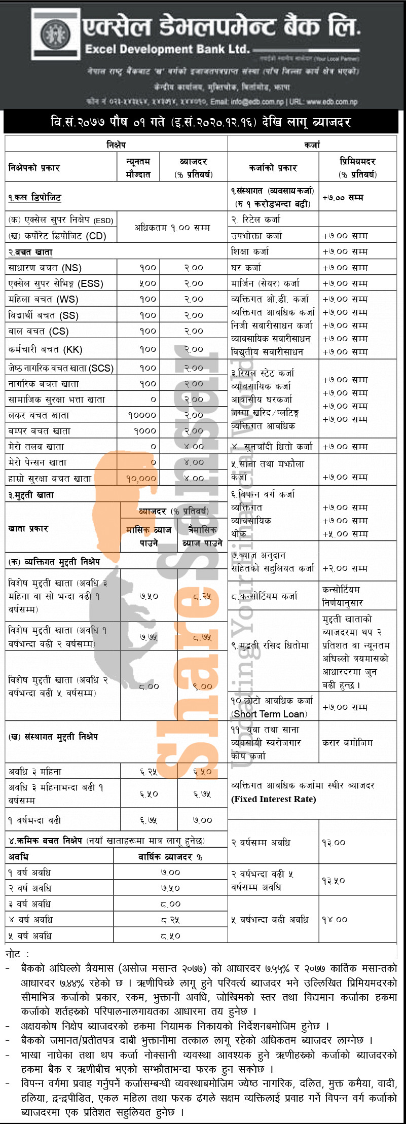 Excel Development Bank Limited has published a notice regarding the new interest rate for its deposit and loan products and it's effective from 1st Poush, 2077.