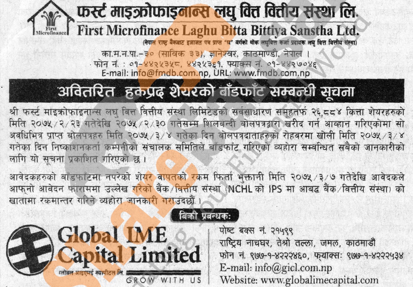 First Microfinance Bittiya Sanstha Limited has allotted its 26,884 units ordinary share in auction to the general public on 4th Ashad, 2075 and refunding money to non-allottee investors from 7th Ashad, 2075.