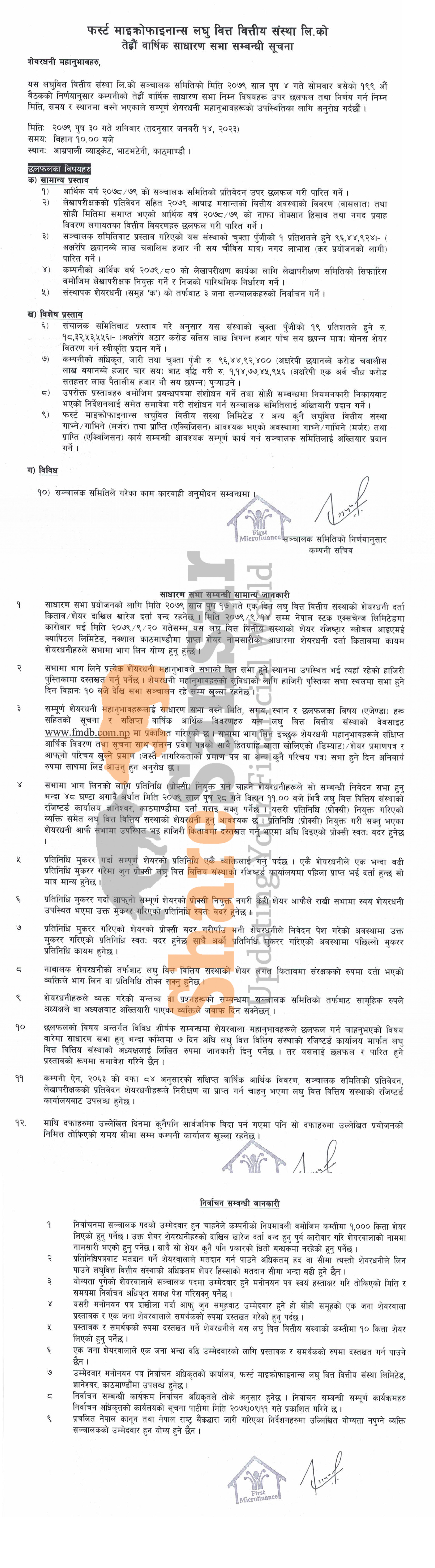 First Microfinance Laghubitta Bittiya Sanstha Limited has announced its 13th AGM going to be held on 30th Poush, 2079.