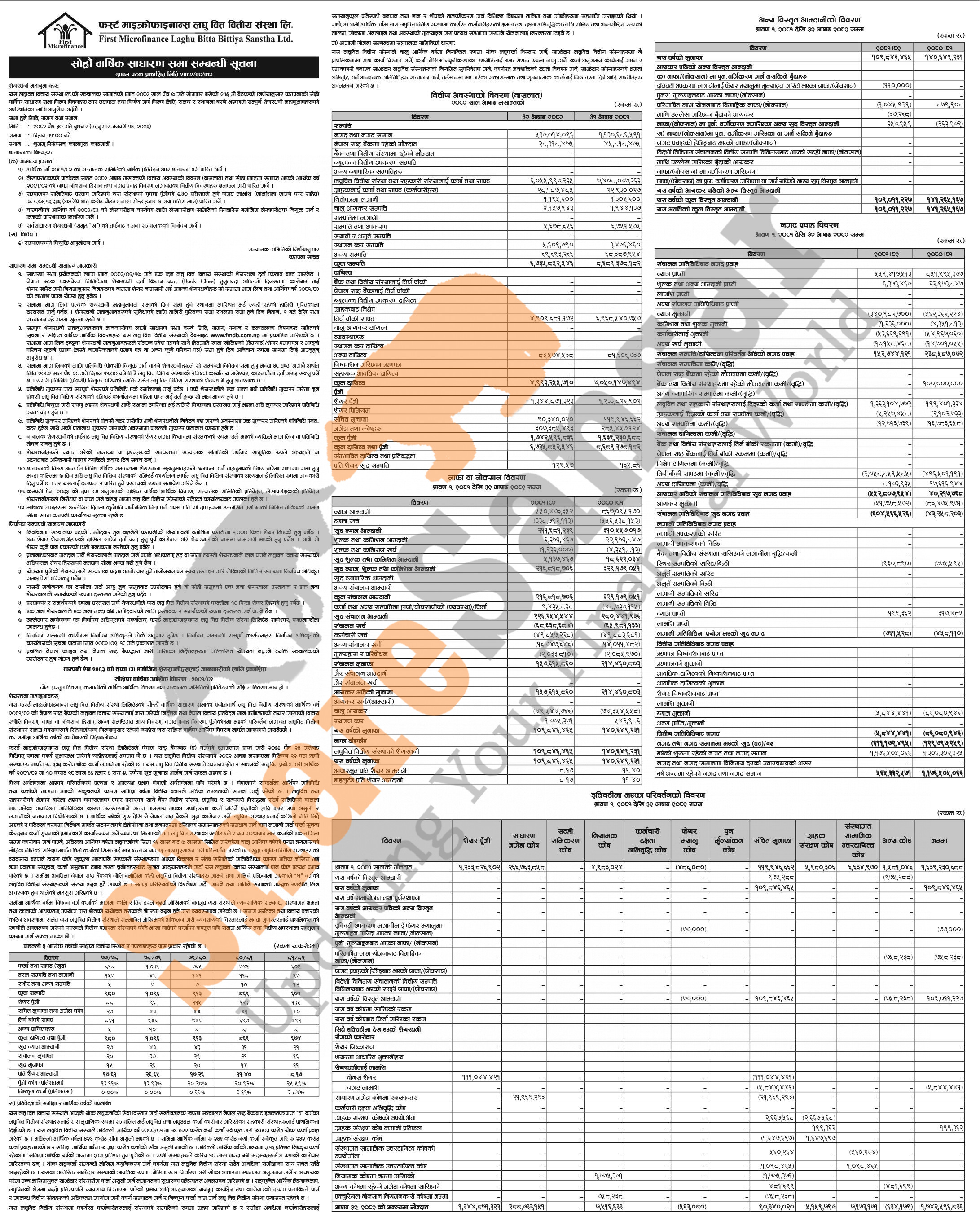 First Microfinance Laghubitta Bittiya Sanstha Limited has announced its 16th AGM going to be held on 30th Poush, 2082 and has published its annual financial highlights of the fiscal year 2081/82.