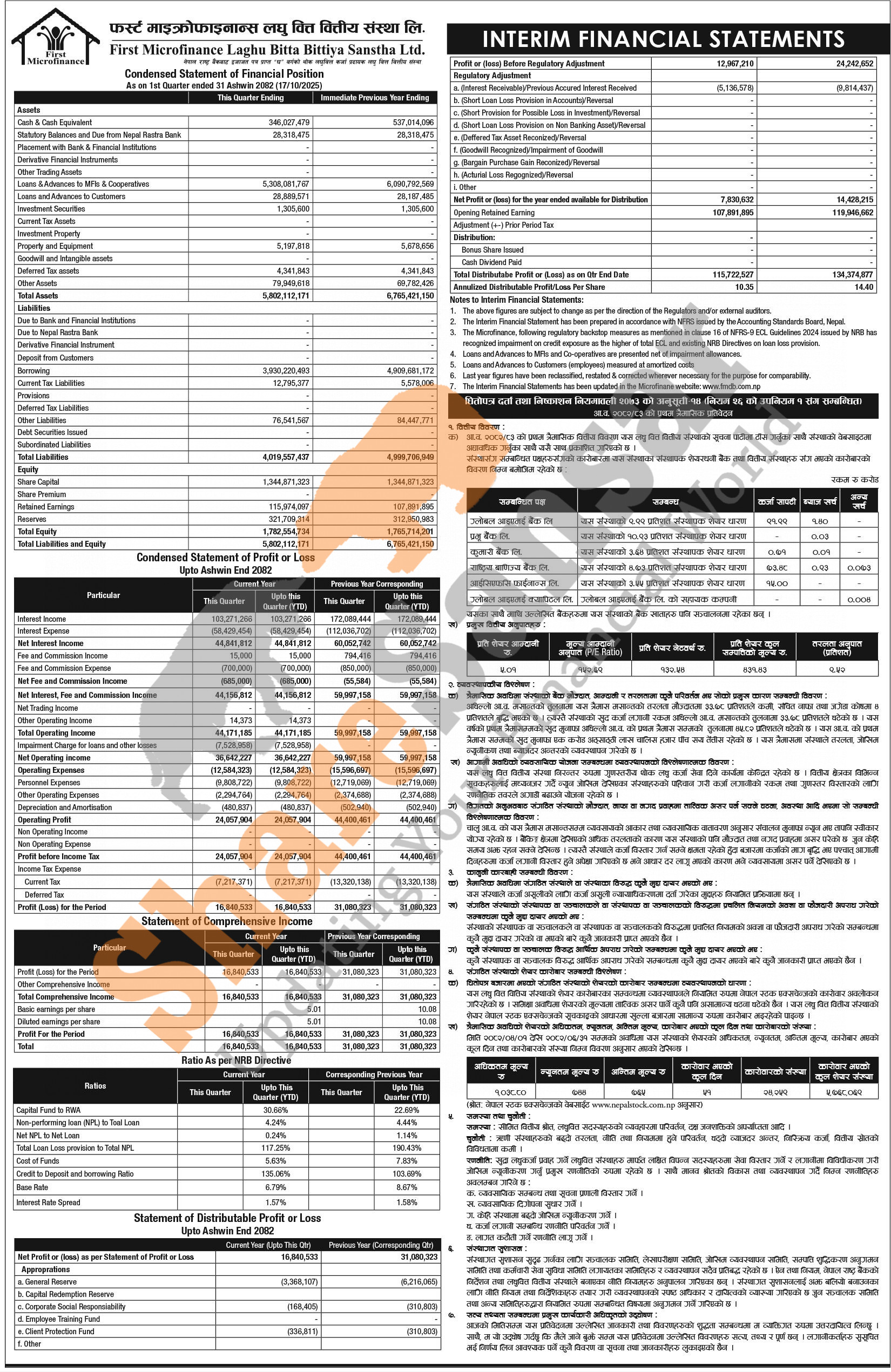 First Microfinance Laghubitta Bittiya Sanstha Limited has posted a net profit of Rs 16.84 million and published its 1st quarter company analysis of the fiscal year 2082/83.
