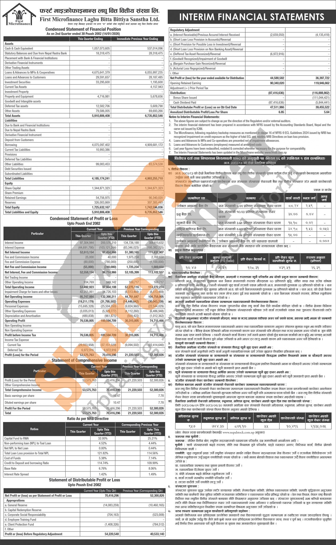 First Microfinance Laghubitta Bittiya Sanstha Limited has posted a net profit of Rs 70.41 million and published its 2nd quarter company analysis of the fiscal year 2082/83.
