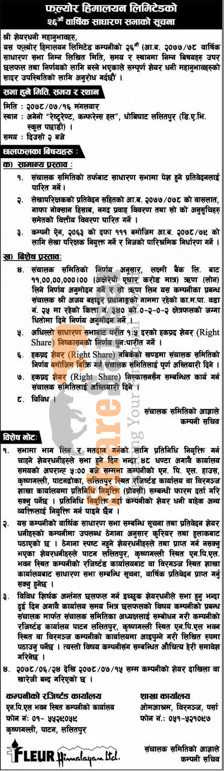 Fleur Himalayan Limited has announced its 26th AGM going to be held on 16th Kartik, 2078.