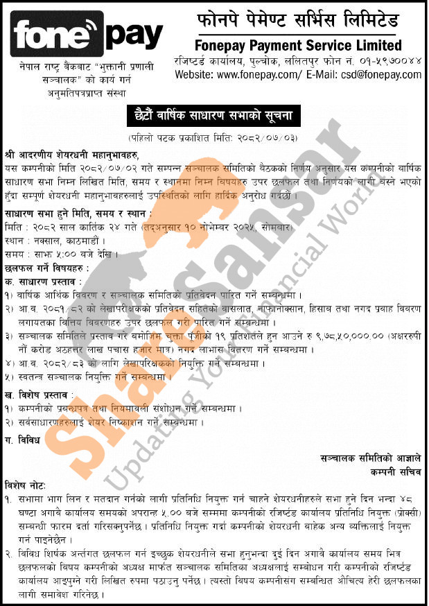 Fonepay Payment Service Limited has announced its 6th AGM going to be held on 24th Kartik, 2082.