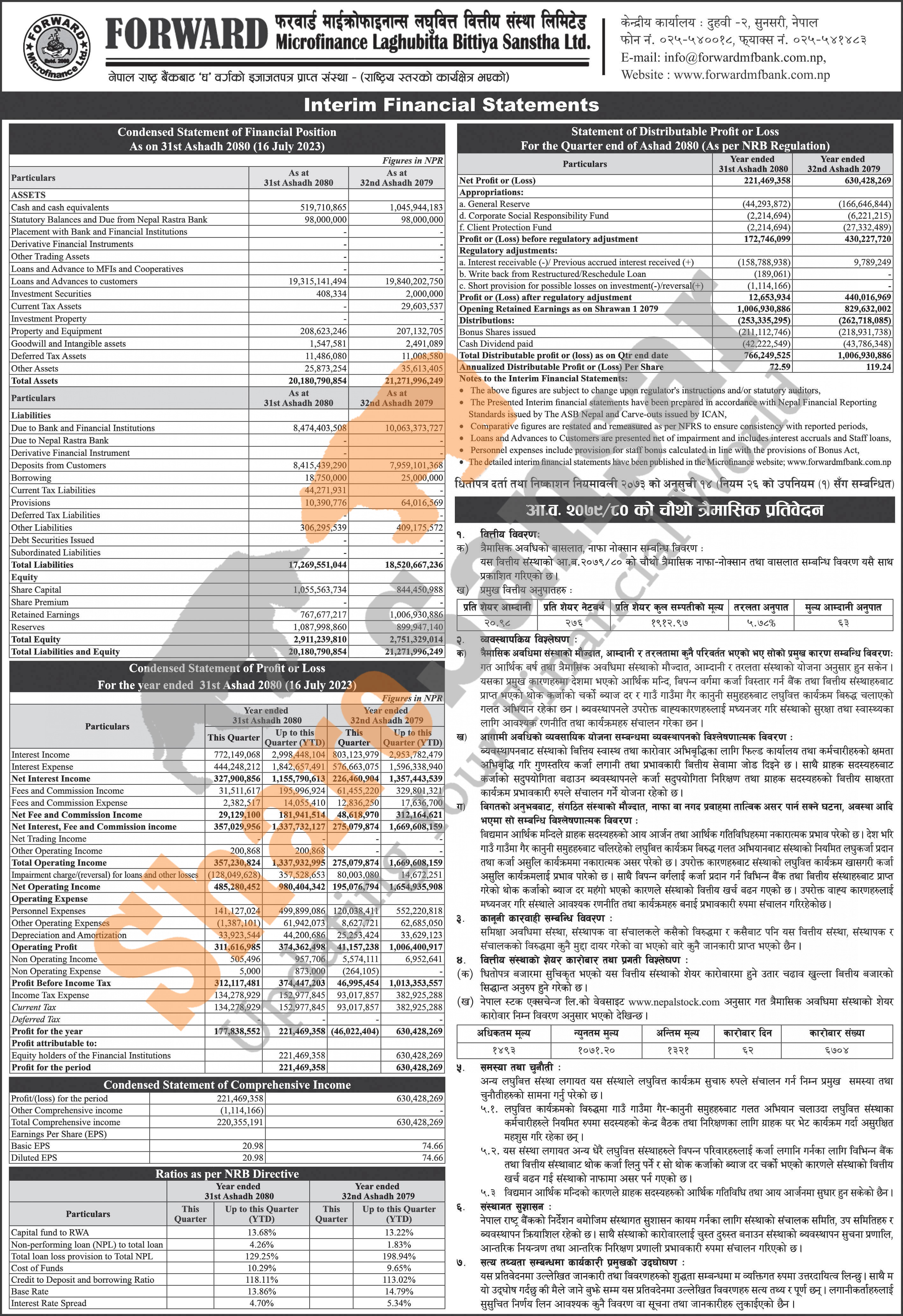 Forward Microfinance Laghubitta Bittiya Sanstha Limited has posted a net profit of Rs 221.46 million and published its 4th quarter company analysis of the fiscal year 2079/80.