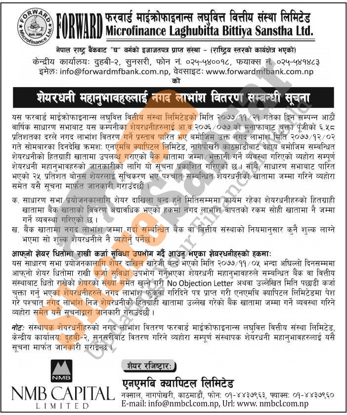 Forward Microfinance Laghubitta Bittiya Sanstha Limited is distributing 6.58% cash dividend directly to bank account and has urged its shareholders to dematerialize their shares.