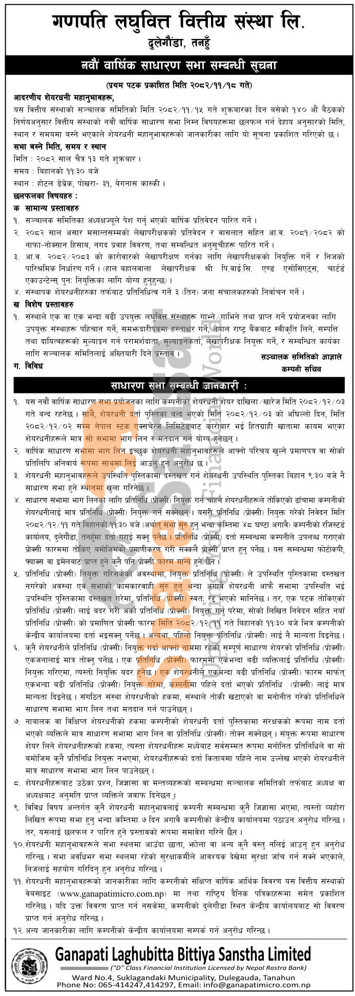 Ganapati Laghubitta Bittiya Sanstha Limited has announced its 9th AGM going to be held on 13th Chaitra, 2082.