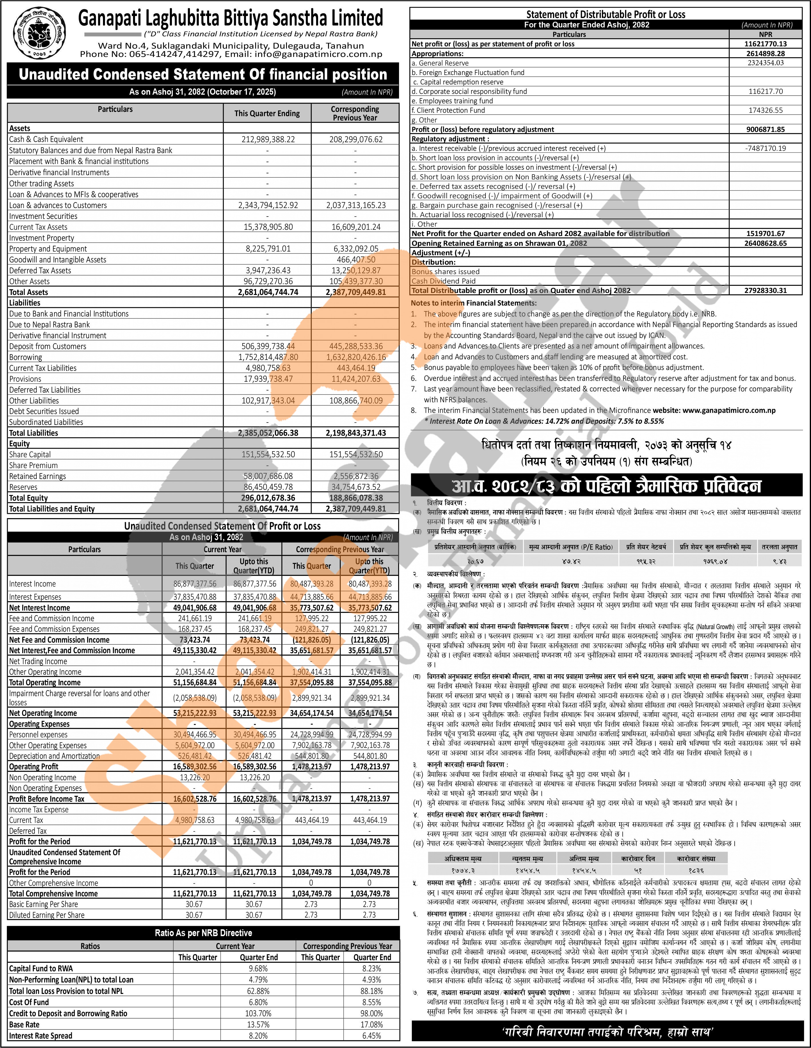 Ganapati Laghubitta Bittiya Sanstha Limited has posted a net profit of Rs 11.62 million and published its 1st quarter company analysis of the fiscal year 2082/83.