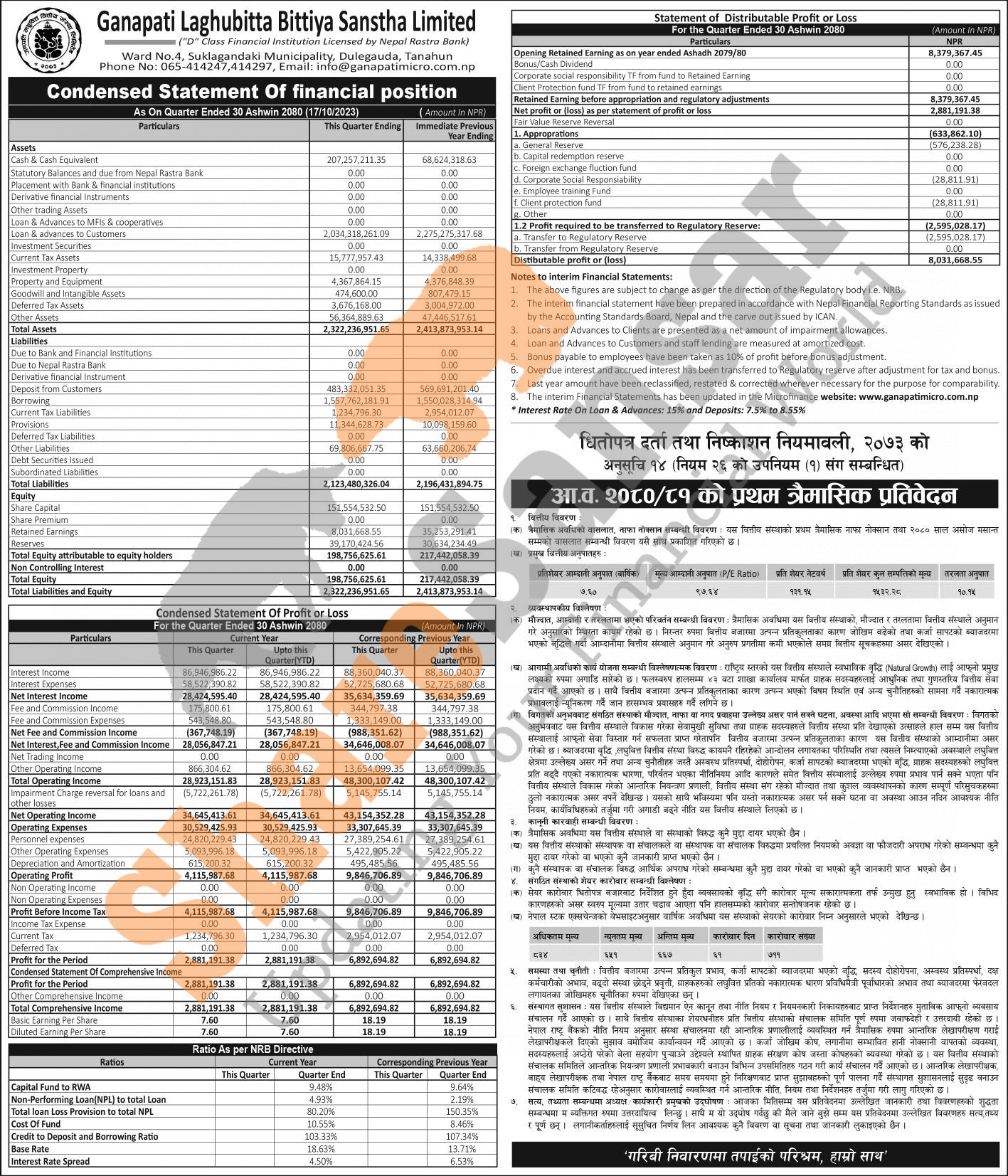 Ganapati Laghubitta Bittiya Sanstha Limited has posted a net profit of Rs 2.88 million and published its 1st quarter company analysis of the fiscal year 2080/81.