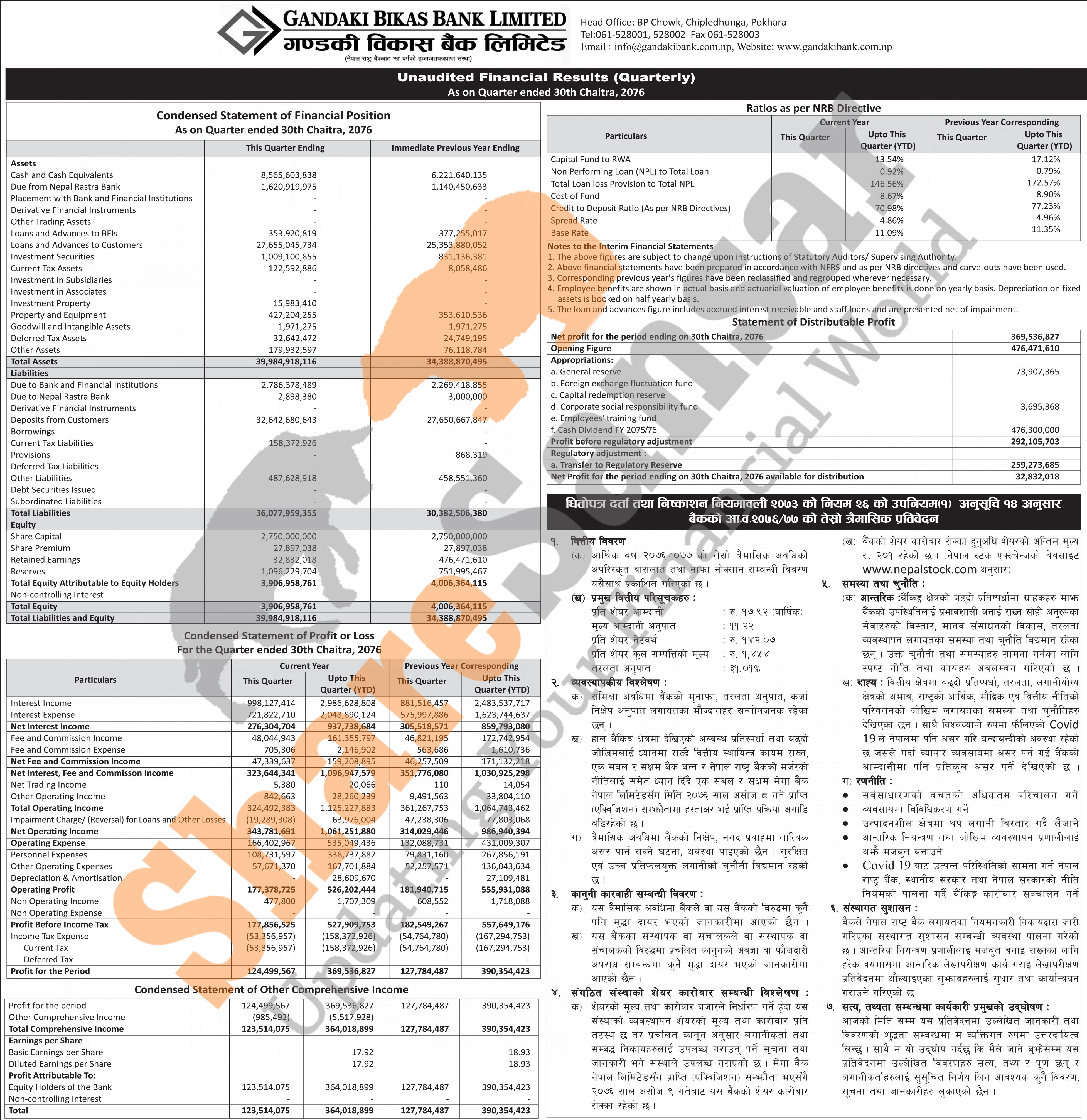 Gandaki Bikas Bank Limited has posted a net profit of Rs 369.53 million and published its 3rd quarter company analysis of the fiscal year 2076/77.