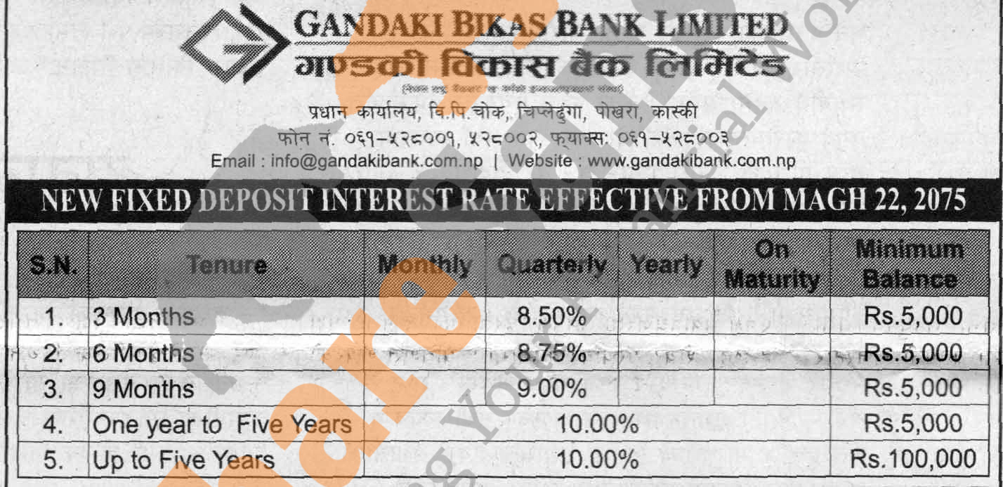 Gandaki Bikas Bank Limited has published a notice regarding new interest rate and its effective from 22nd Magh, 2075.