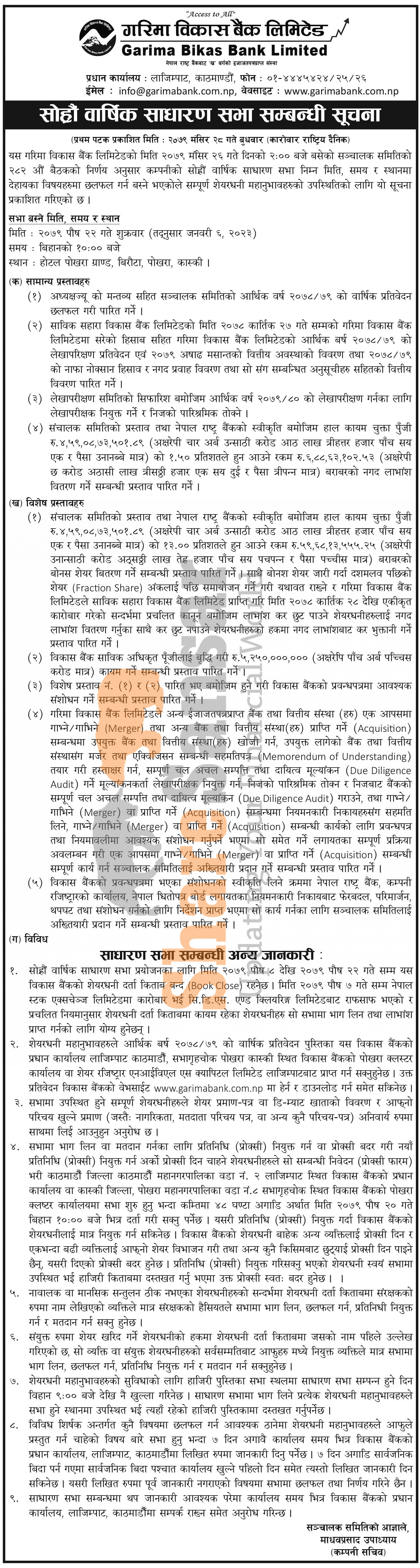 Garima Bikas Bank Limited has announced its 16th AGM going to be held on 22nd Poush, 2079.