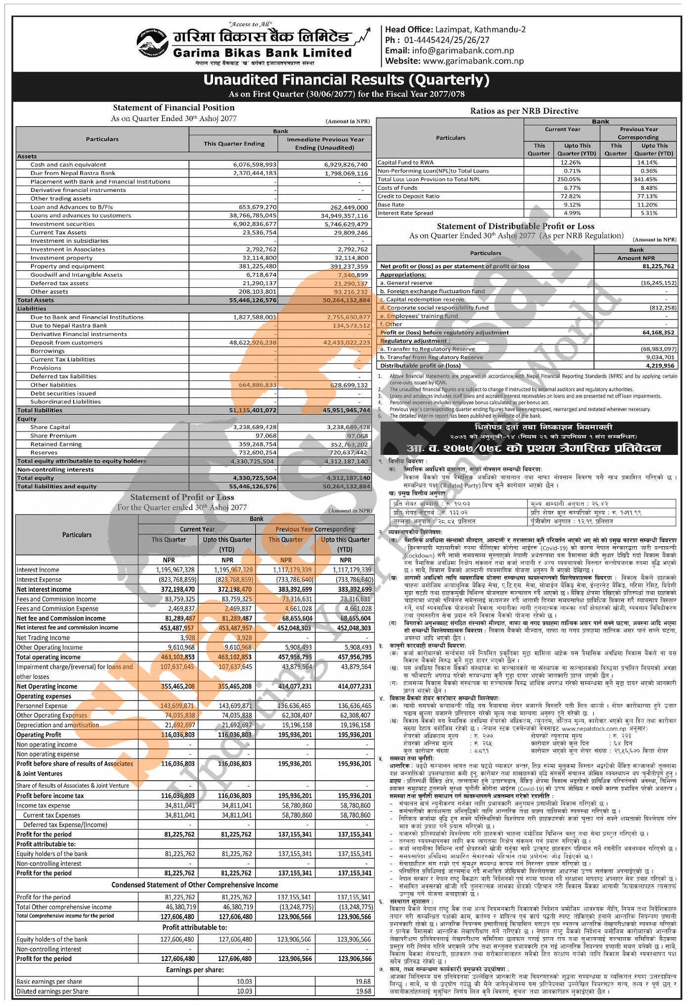 Garima Bikas Bank Limited has posted a net profit of Rs 81.22 million and published its 1st quarter company analysis of the fiscal year 2077/78.