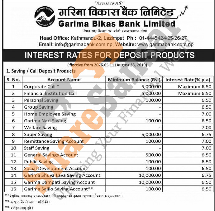 Garima Bikas Bank Limited has published a notice regarding new interest rate and its effective from 11th Bhadra, 2076.