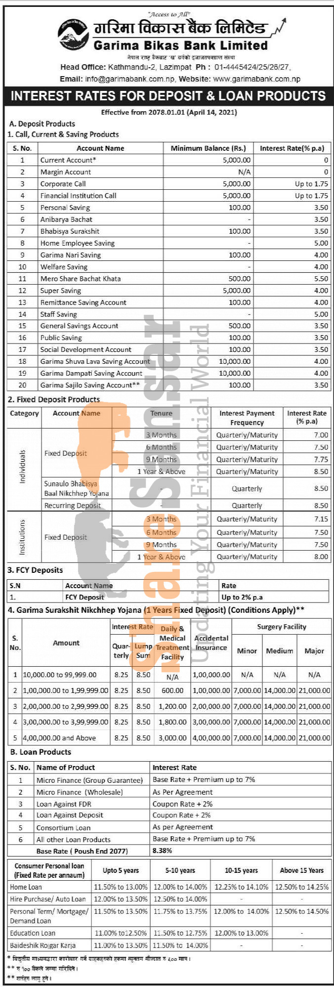 Garima Bikas Bank Limited has published a notice regarding the new interest rate for deposit and loan products and it's effective from 1st Baisakh, 2078.