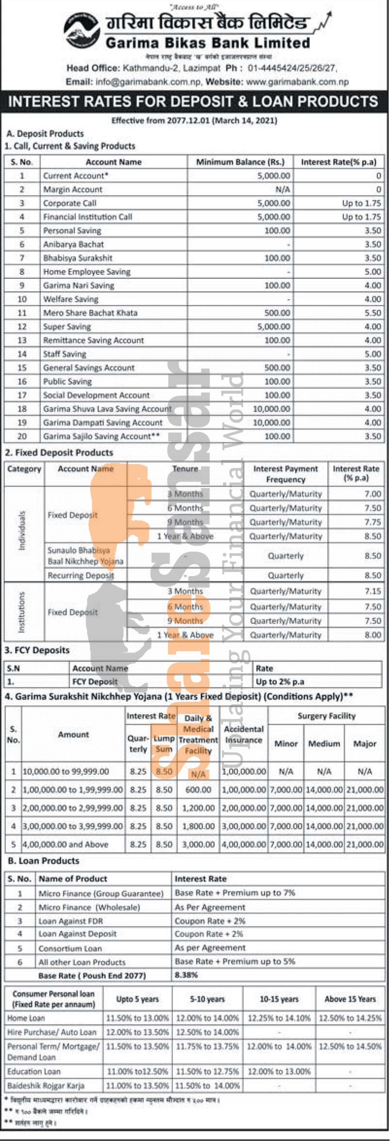 Garima Bikas Bank Limited has published a notice regarding the new interest rate for deposit and loan products and it's effective from 1st Chaitra, 2077.