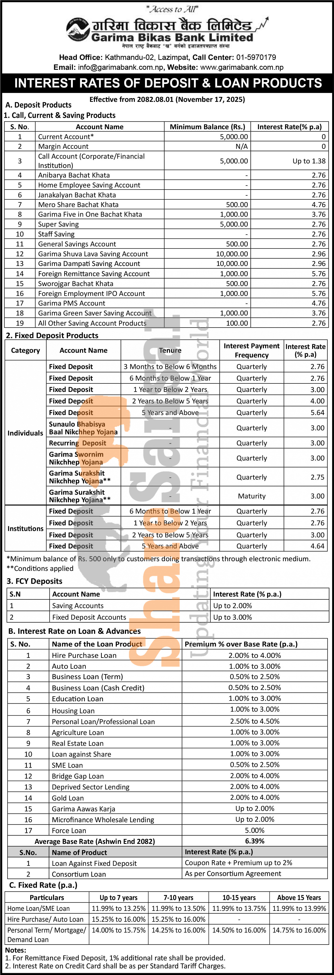 Garima Bikas Bank Limited has published a notice regarding the new interest rate for deposit and loan products and it's effective from 1st Mangsir, 2082.