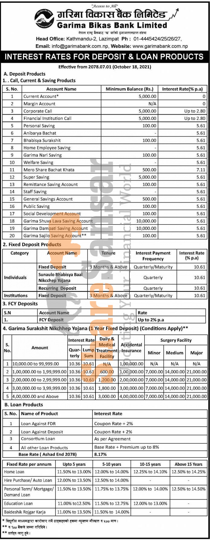 Garima Bikas Bank Limited has published a notice regarding the new interest rate for its deposit and loan products and it's effective from 1st Kartik, 2078.