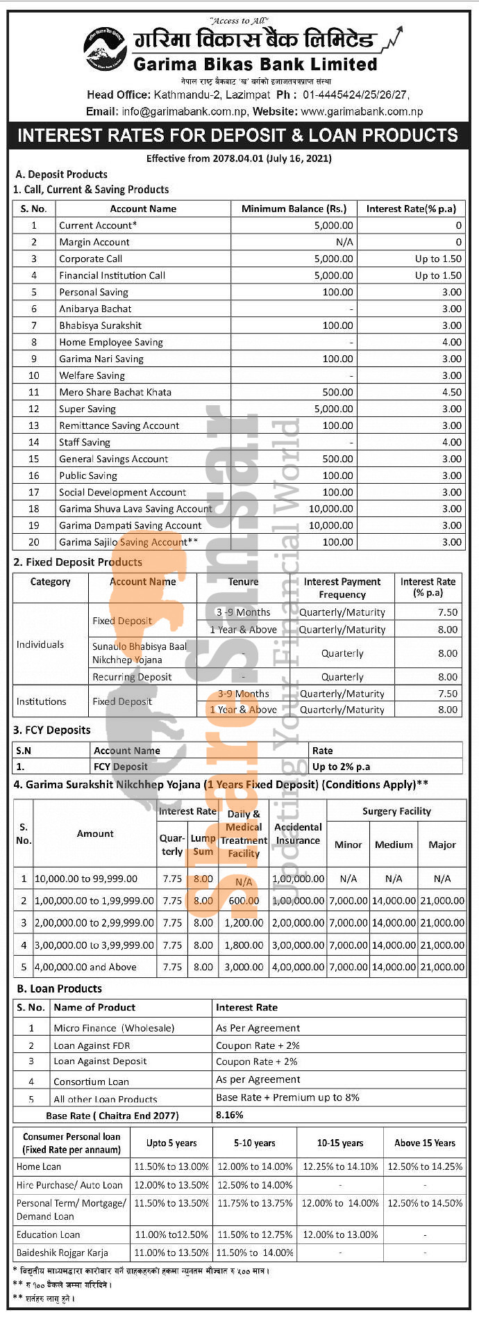 Garima Bikas Bank Limited has published a notice regarding the new interest rate for its deposit and loan products and it's effective from 1st Shrawan, 2078.