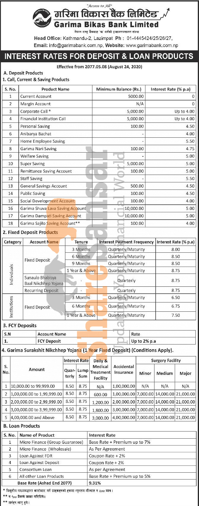 Garima Bikas Bank Limited has published a notice regarding the new interest rate for its deposit and loan products and its effective from 8th Bhadra, 2077.