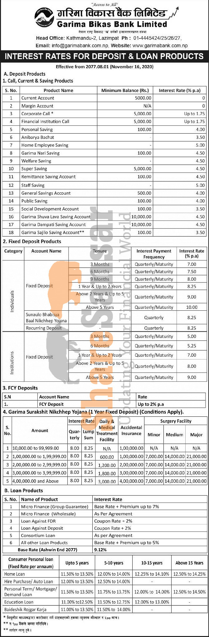 Garima Bikas Bank Limited has published a notice regarding the new interest rate for its deposit products and loan and it's effective from 1st Mangsir, 2077.