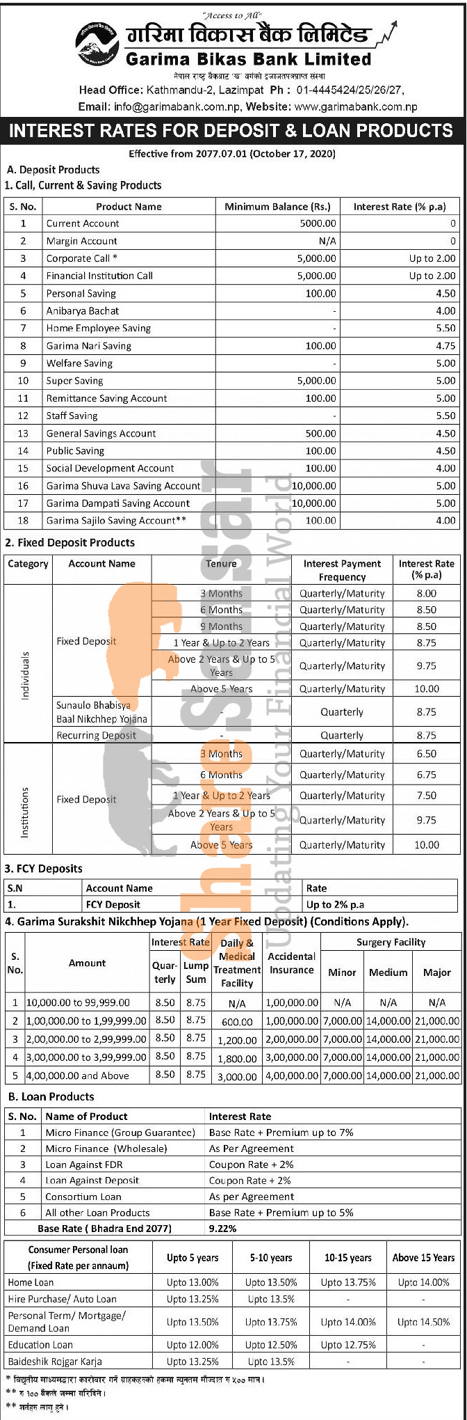 Garima Bikas Bank Limited has published a notice regarding the new interest rate for its loan and deposit products and it's effective from 1st Kartik, 2077.