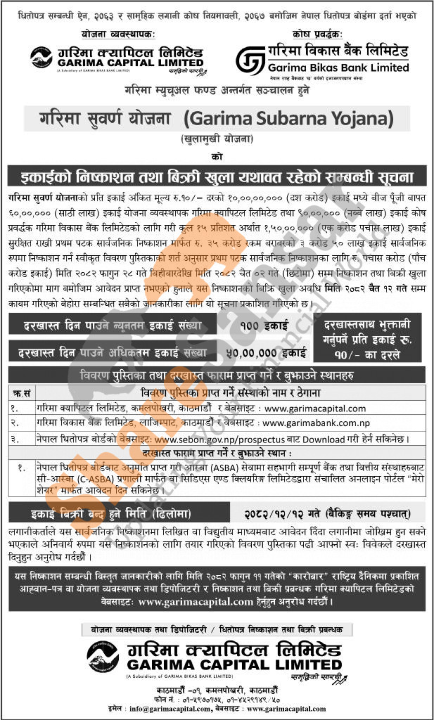 Garima Capital Limited has extended its 100 million units of Rs 10 face value each mutual fund scheme "Garima Subarna Yojana" to the general public till 12th Chaitra, 2082.