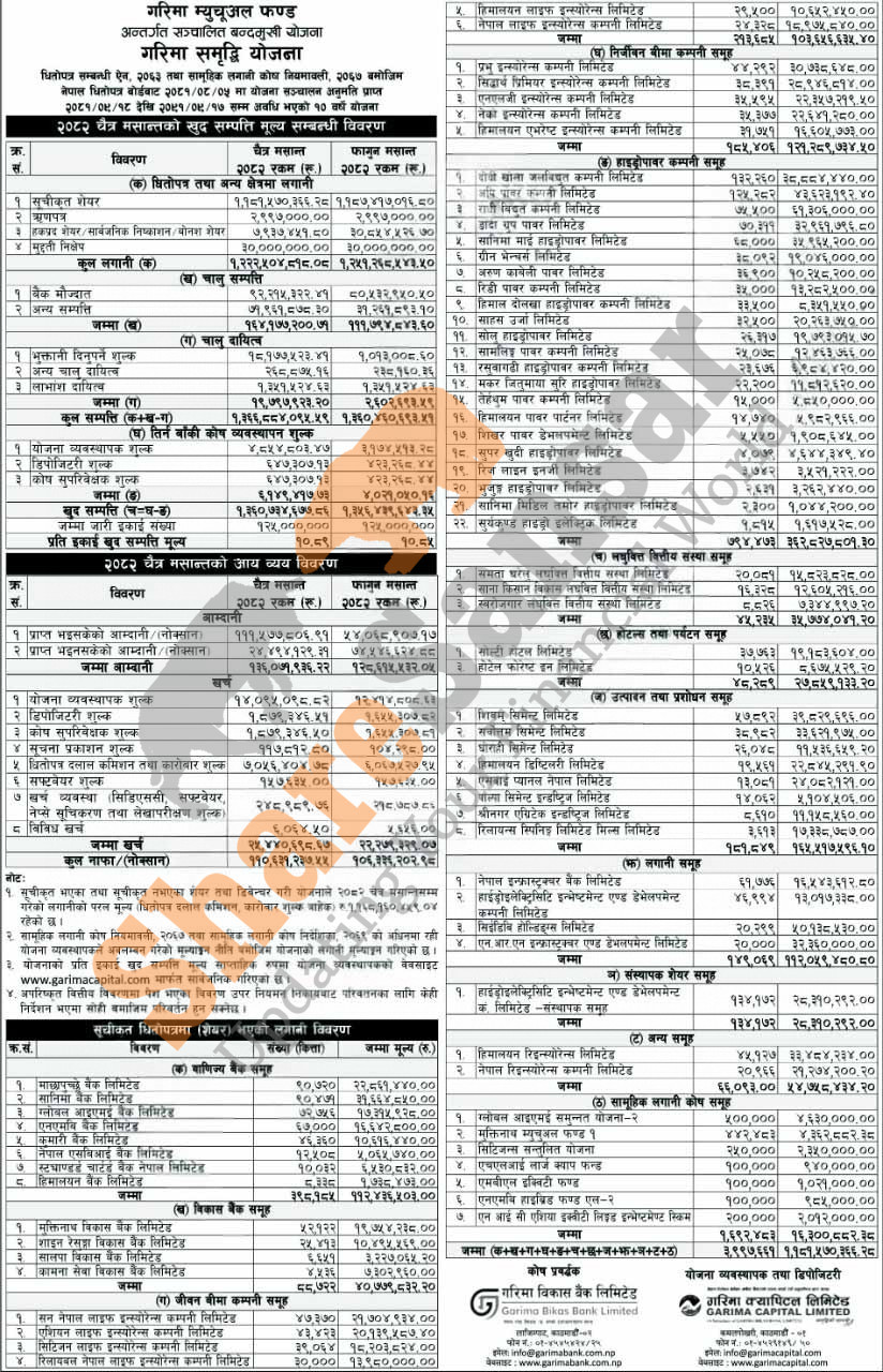 Garima Capital Limited has published "Garima Samriddhi Yojana" Net Assets Value (NAV) till Chaitra, 2082.
