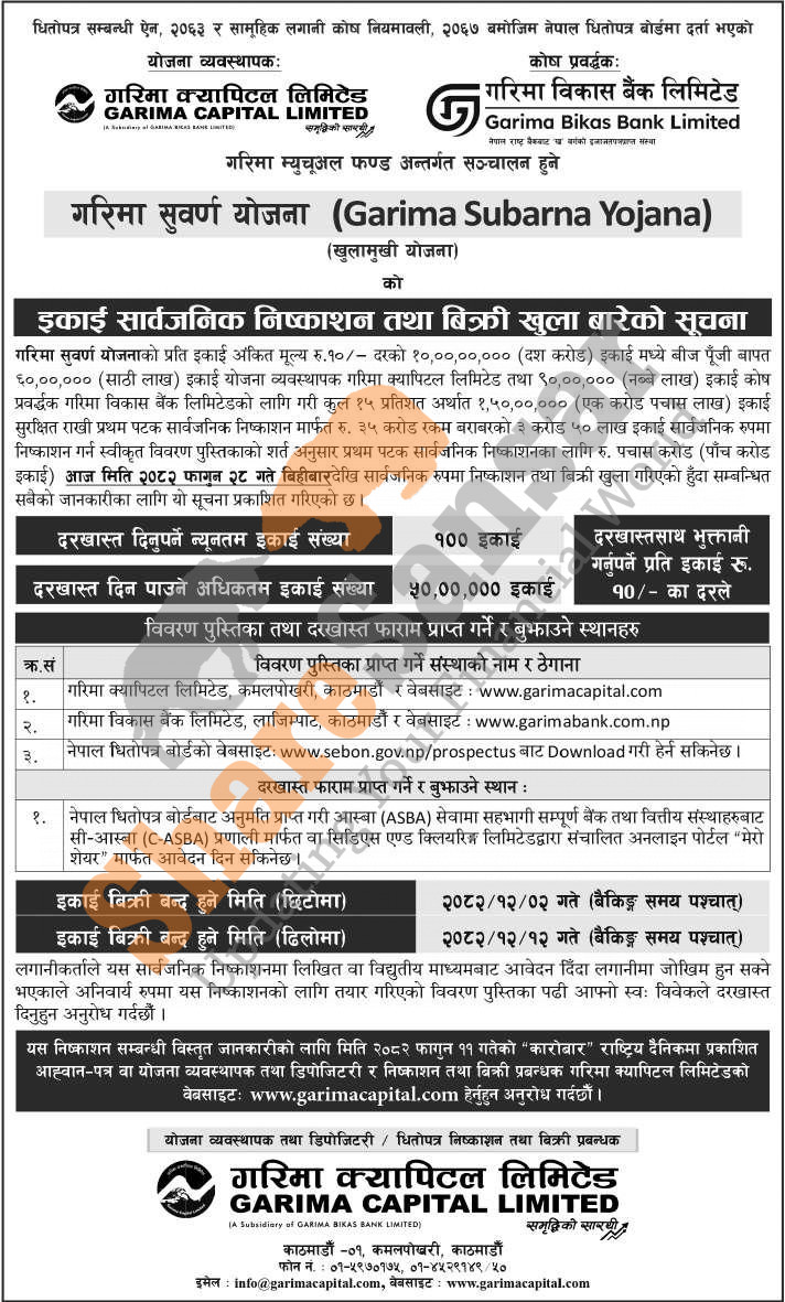 Garima Capital Limited is opening its 100 million units of Rs 10 face value each mutual fund scheme "Garima Subarna Yojana" to the general public from today (28th Falgun, 2082).