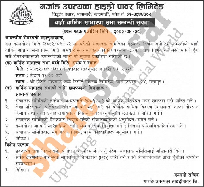 Garjang Upatyaka Hydropower Limited has announced its 12th AGM going to be held on 30th Poush, 2082.