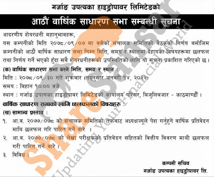 Garjang Upatyaka Hydropower Limited has announced its 8th AGM going to be held on 30th Poush, 2078.
