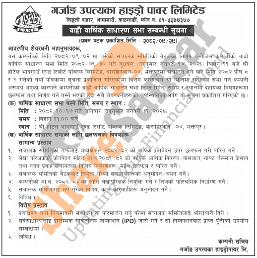 Garjang Upatyaka Hydropower Limited has postponed its 12th AGM date to 17th Magh, 2082.