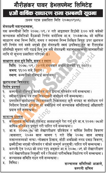 Gaurishankar Power Development Limited has announced its 5th AGM going to be held on 27th Poush, 2078.