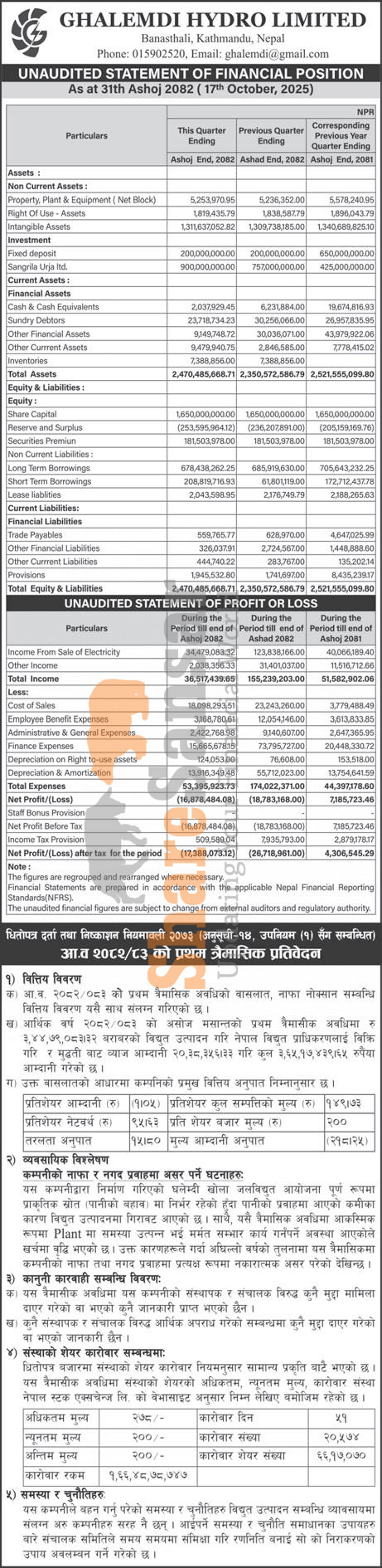 Ghalemdi Hydro Limited has posted a net loss of Rs 17.38 million and published its 1st quarter company analysis of the fiscal year 2082/83.