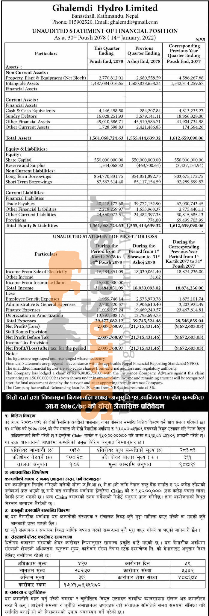 Ghalemdi Hydro Limited has posted a net profit of Rs 2 million and published its 2nd quarter company analysis of the fiscal year 2078/79.