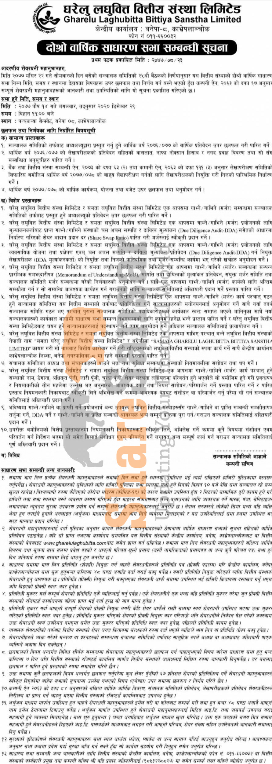 Gharelu Laghubitta Bittiya Sanstha Limited has announced its 2nd AGM going to be held on 14th Poush, 2077.