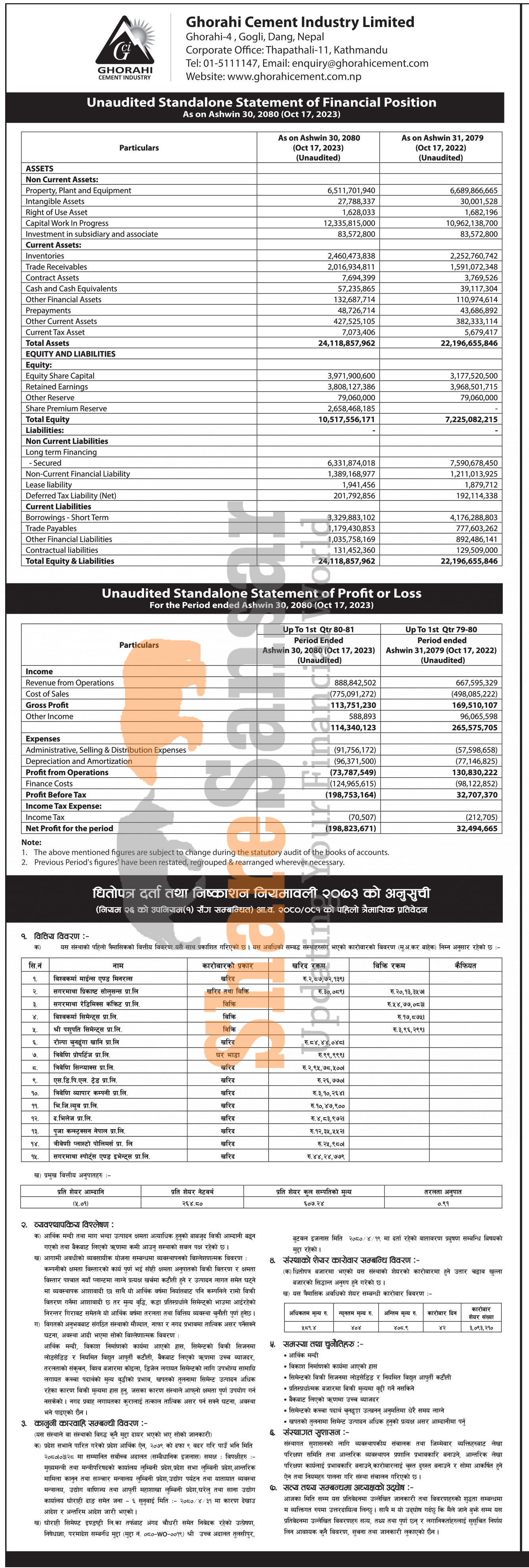 Ghorahi Cement Industry Limited has posted a net loss of Rs 198.82 million and published its 1st quarter company analysis of the fiscal year 2080/81.