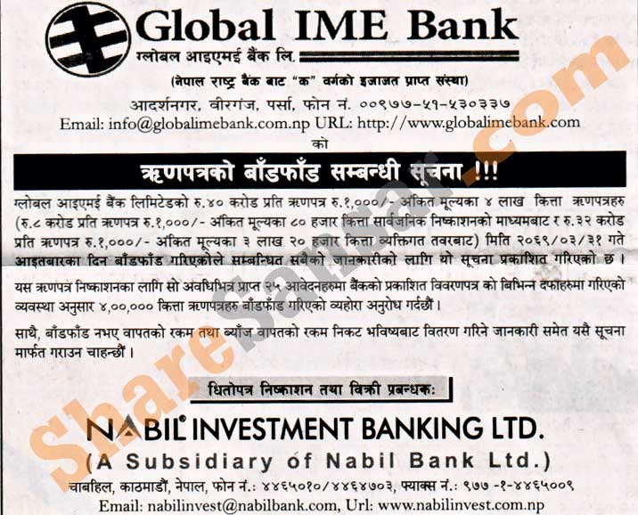 Global IME Bank Limited has allotted 4,00,000 units debenture issue to the general public on 15th July, 2012.