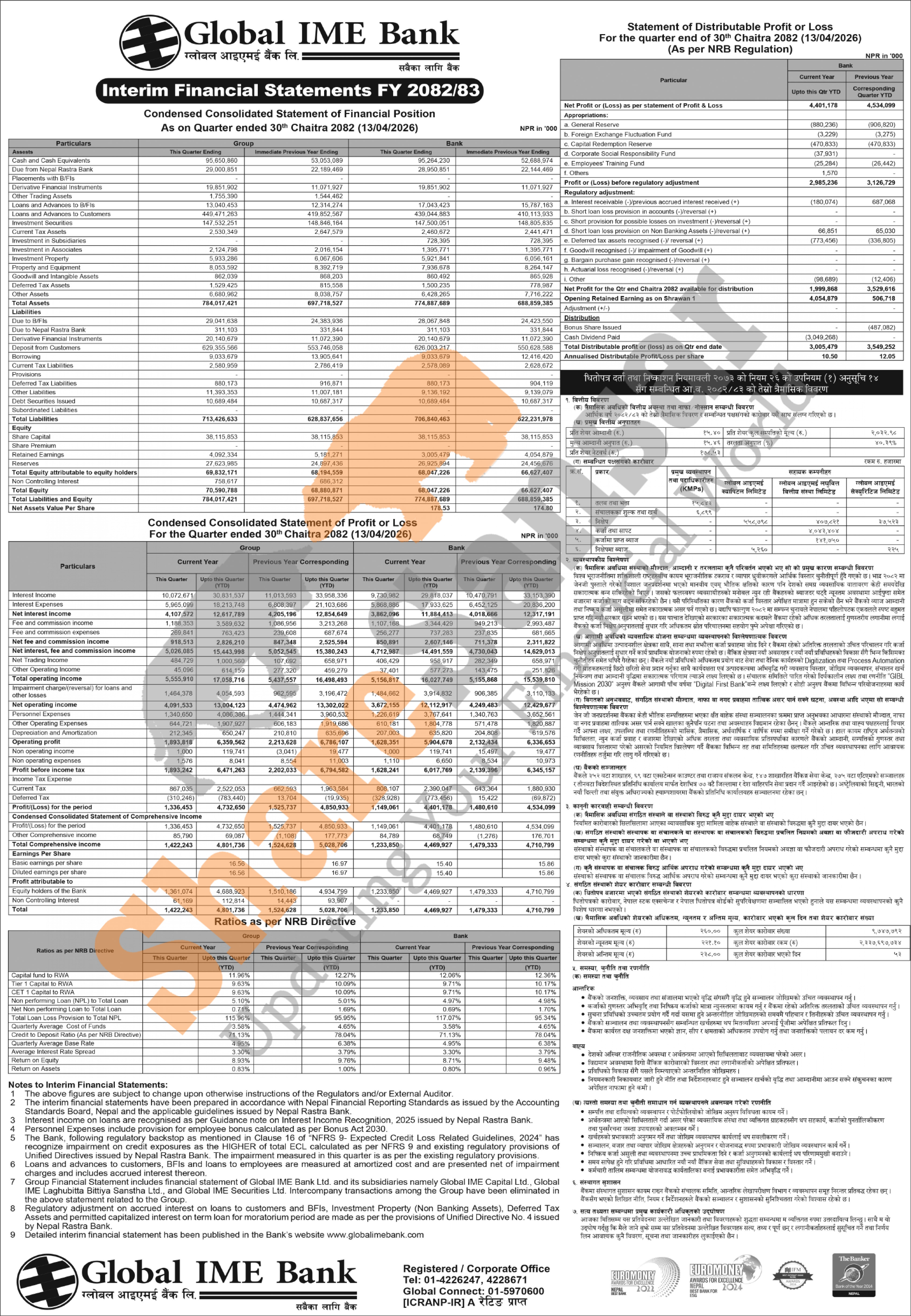Global IME Bank Limited has posted a net profit of Rs 4.40 billion and published its 3rd quarter company analysis of the fiscal year 2082/83.
