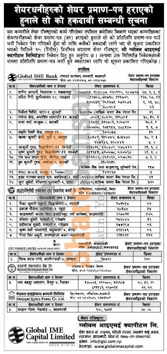 Global IME Bank Limited has published a notice regarding a claim for lost share certificates.