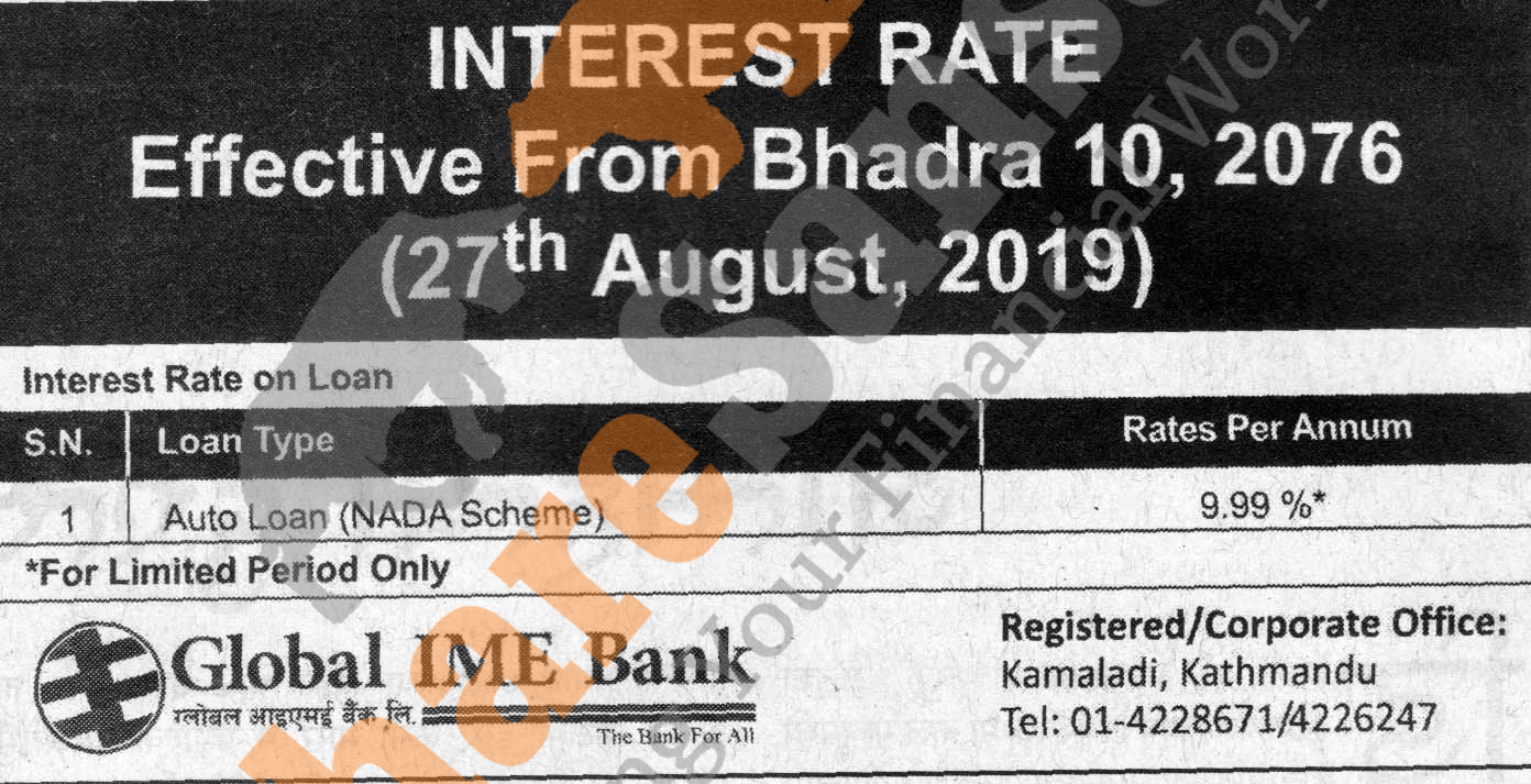 Global IME Bank Limited has published a notice regarding new interest rate and its effective from 10th Bhadra, 2076.