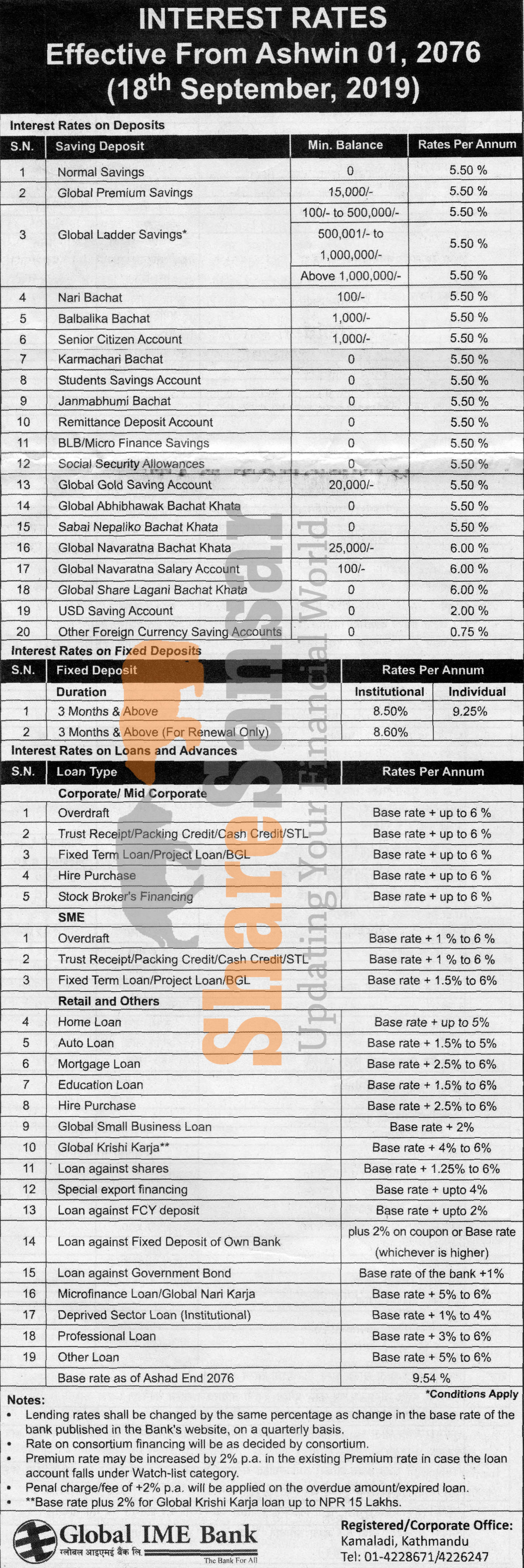 Global IME Bank Limited has published a notice regarding new interest rate and its effective from 1st Ashwin, 2076.
