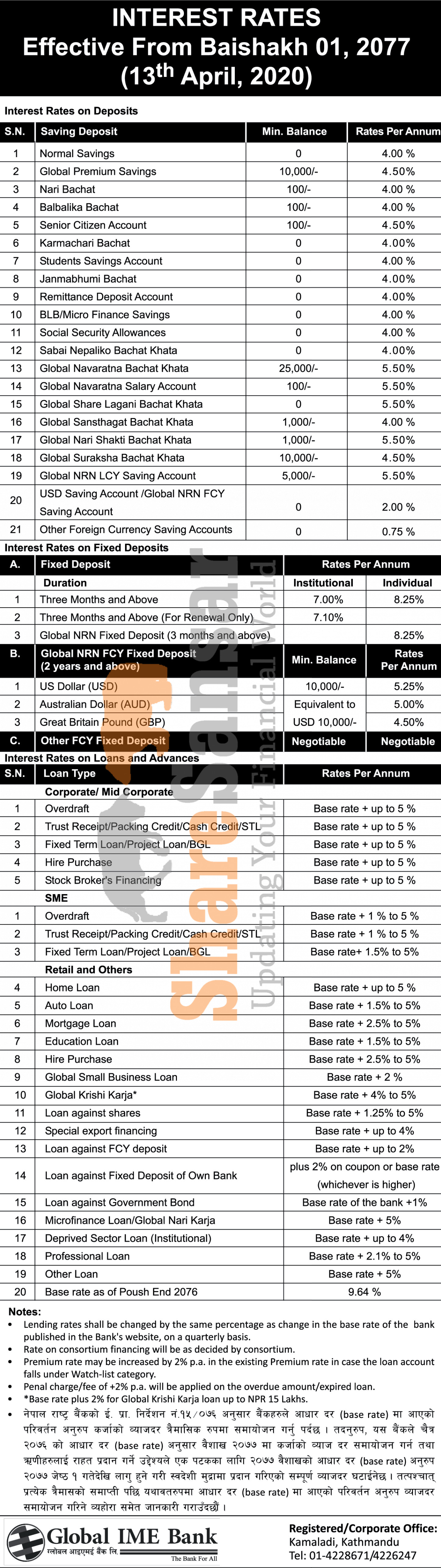 Global IME Bank Limited has published a notice regarding new interest rate and its effective from 1st Baishakh, 2077.