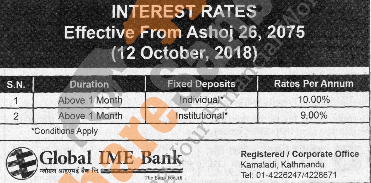Global IME Bank Limited has published a notice regarding new interest rate and its effective from 26th Ashwin, 2075.