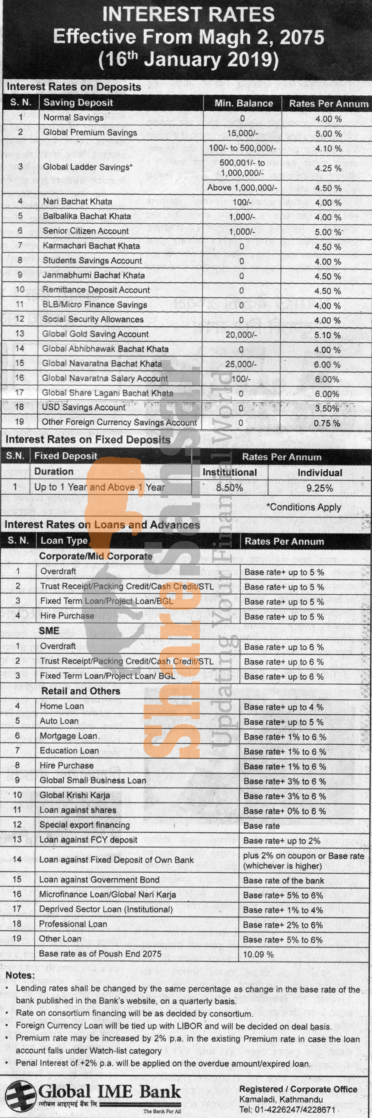 Global IME Bank Limited has published a notice regarding new interest rate and its effective from 2nd Magh, 2075.