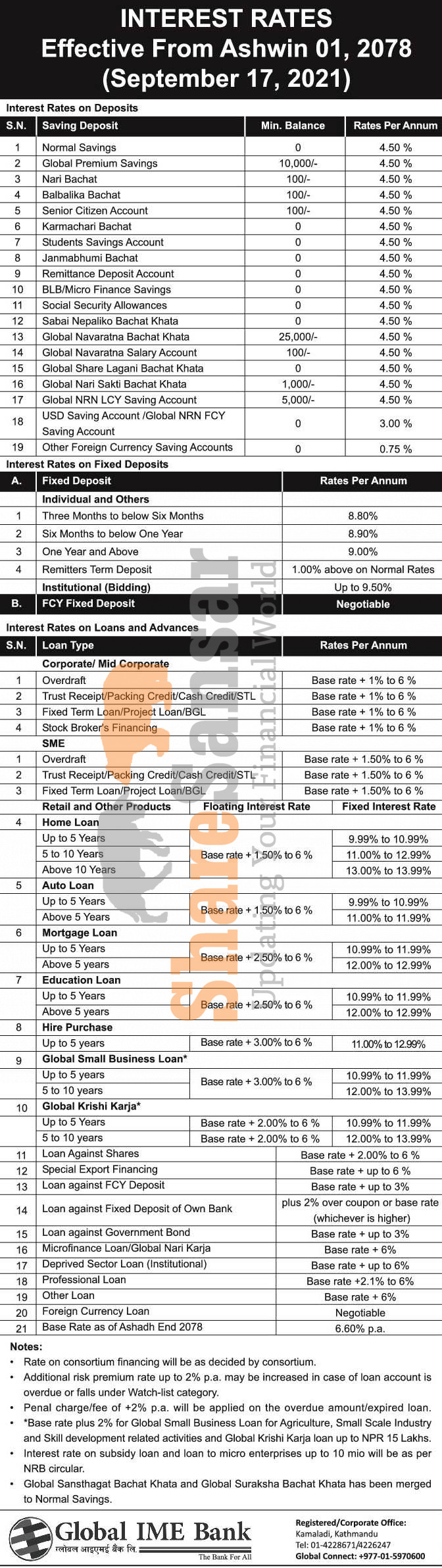 Global IME Bank Limited has published a notice regarding the new interest rate for deposit and loan products and it's effective from 1st Ashwin, 2078.