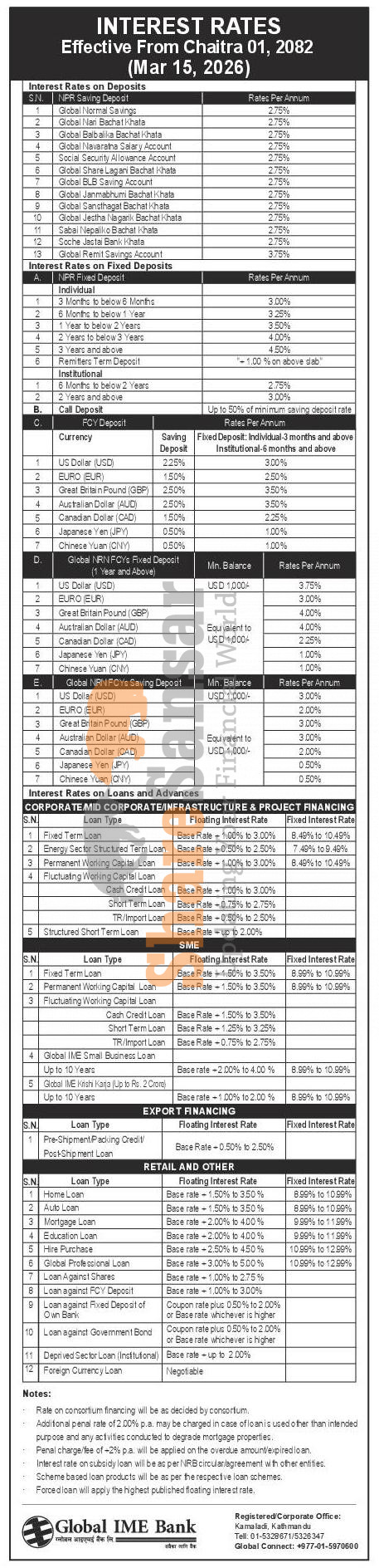Global IME Bank Limited has published a notice regarding the new interest rate for deposit and loan products and it's effective from 1st Chaitra, 2082.