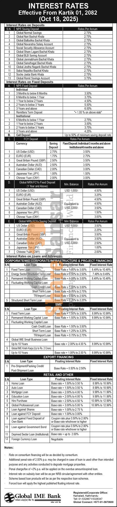 Global IME Bank Limited has published a notice regarding the new interest rate for deposit and loan products and it's effective from 1st Kartik, 2082.