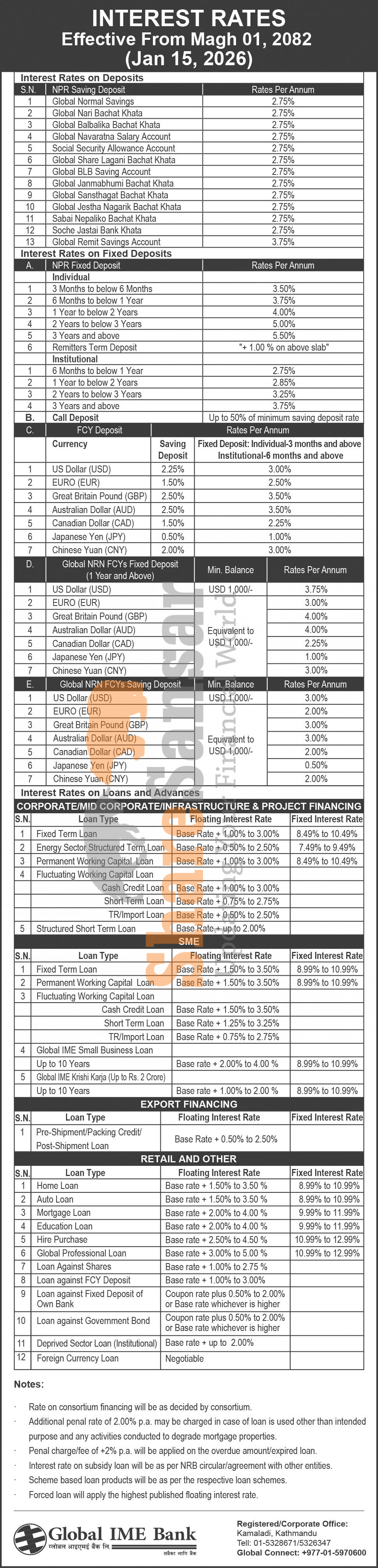 Global IME Bank Limited has published a notice regarding the new interest rate for deposit and loan products and it's effective from 1st Magh, 2082.