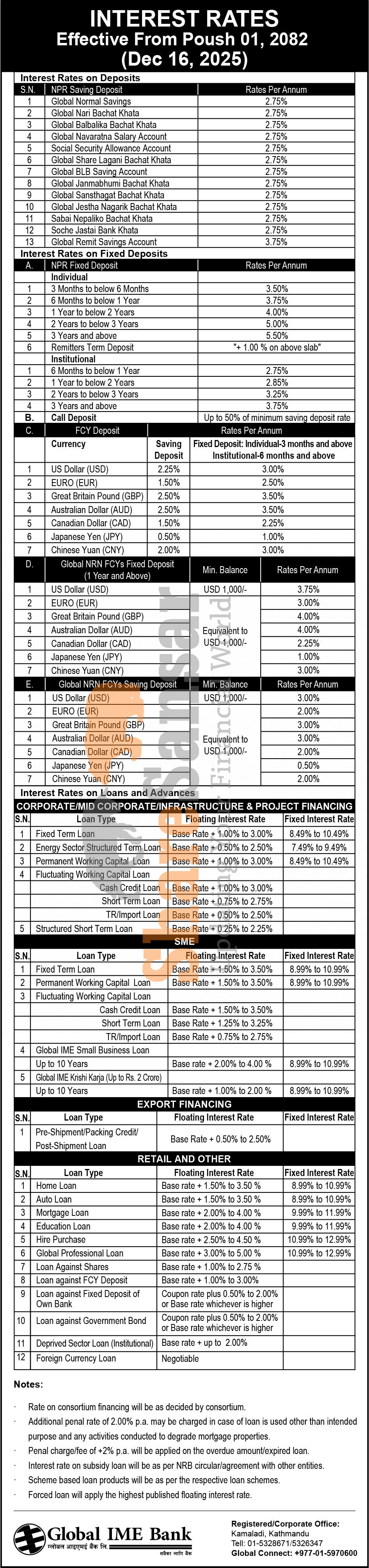 Global IME Bank Limited has published a notice regarding the new interest rate for deposit and loan products and it's effective from 1st Poush, 2082.